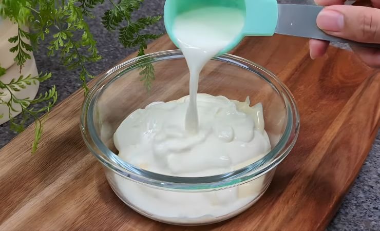 2. Add the Milk: Pour one-quarter cup of milk into the bowl. The milk loosens up the thick mayo and sour cream mixture. This makes the dressing easy to pour and drizzle over your food.