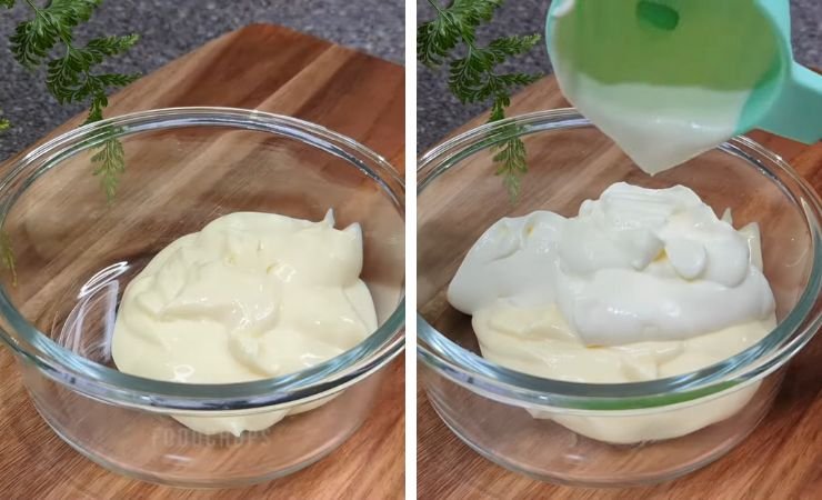 1. Combine the Creamy Bases: Grab your medium-sized mixing bowl. Scoop one-half cup of mayonnaise into the bowl. Add one-half cup of sour cream right next to it.