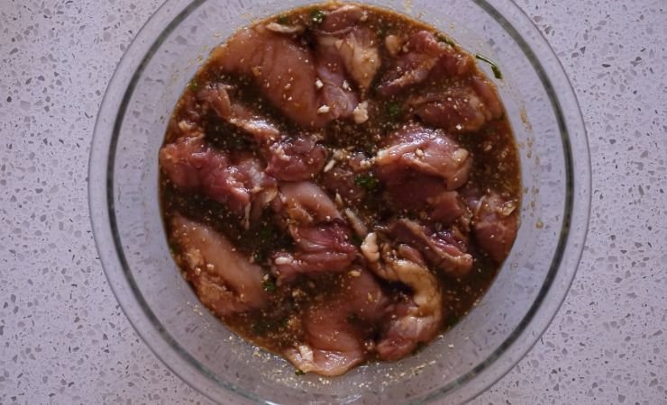 2. Add the chicken thighs to the bowl. Turn and press them down so every piece is fully coated in the sauce.