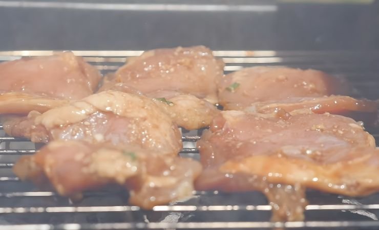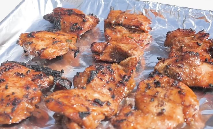 Each thigh should be roughly the same size so they cook evenly on the grill. This ensures every piece finishes at the same time. Fresh chicken works better than frozen, but thawed chicken is fine too.