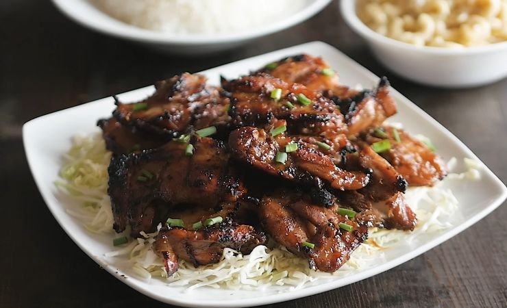 6. Transfer chicken to a plate and let rest for 5 minutes. Serve whole or sliced with white rice, mac salad, and shredded cabbage.
