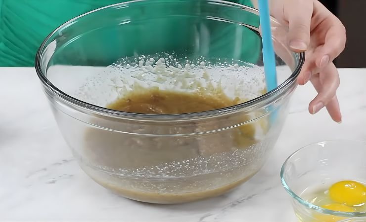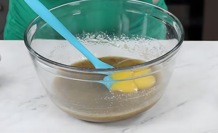 - Mix the Sugars and Butter: Pour the brown sugar and white sugar into the bowl of melted butter. Stir until the mixture becomes smooth and thick. There should be no dry spots.