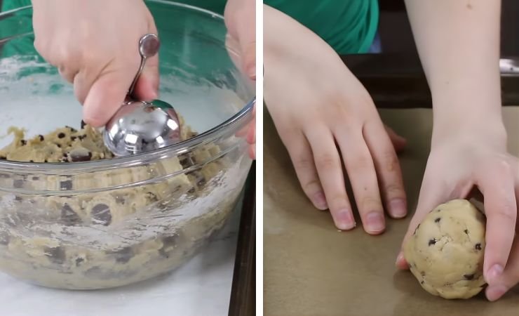 - Scoop the Dough: Scoop large portions of dough, about ½ cup each. Roll them gently into round balls so the cookies bake evenly.