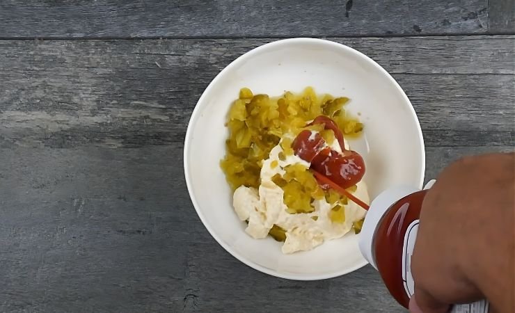 The ketchup brings color and sweetness to the mix. You’ll see the sauce start to turn pink right away. The tomato flavor balances the sour pickles perfectly.