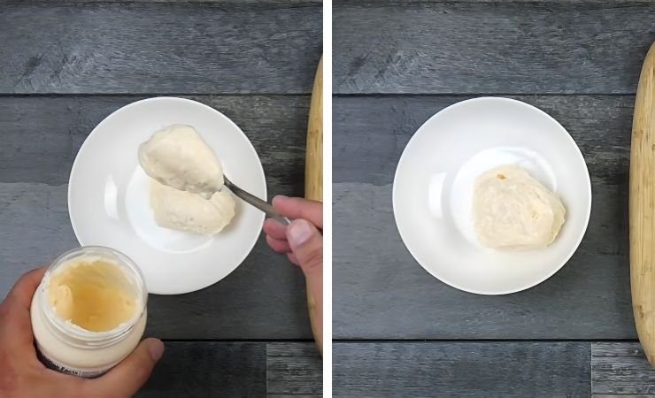 - Place three heaping tablespoons of mayonnaise into the mixing bowl. Spread it out so it’s easy to stir later.