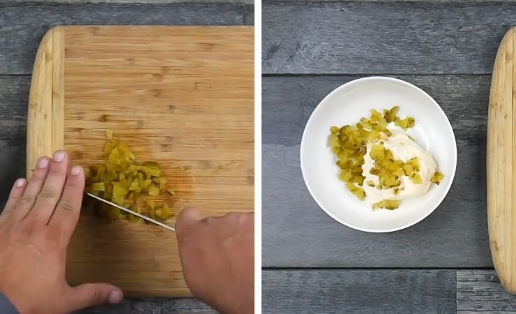 - Slice about six pickles into very small pieces. The small dice helps the sauce stay smooth while keeping a tiny crunch. Place the chopped pickles into the bowl with the mayo.