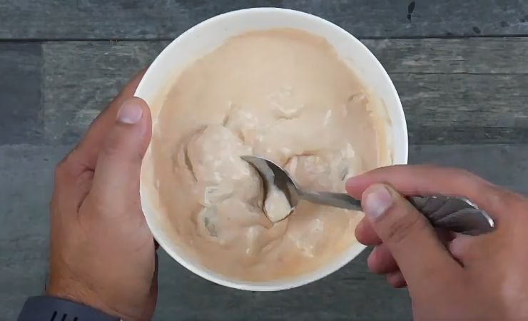 5. Mix Everything: Use your spoon to stir all the ingredients together. Stir in circles and make sure to scrape the sides of the bowl. Keep stirring until the sauce looks smooth and the color is even throughout.