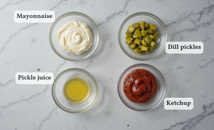 3. Pickle Juice (1 tablespoon): This liquid from the pickle jar is important. It adds a strong tangy taste and helps thin the sauce just a little. Using the juice makes the flavor really pop.