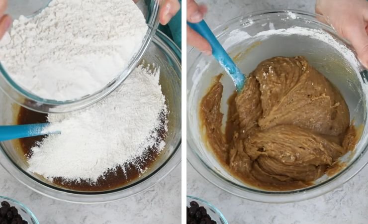 5. Add Dry Mix to Wet Mix Slowly: Add half of the dry mix to the wet bowl. Stir until blended. Add the rest and mix again. The dough will feel thick and heavy. That is normal.