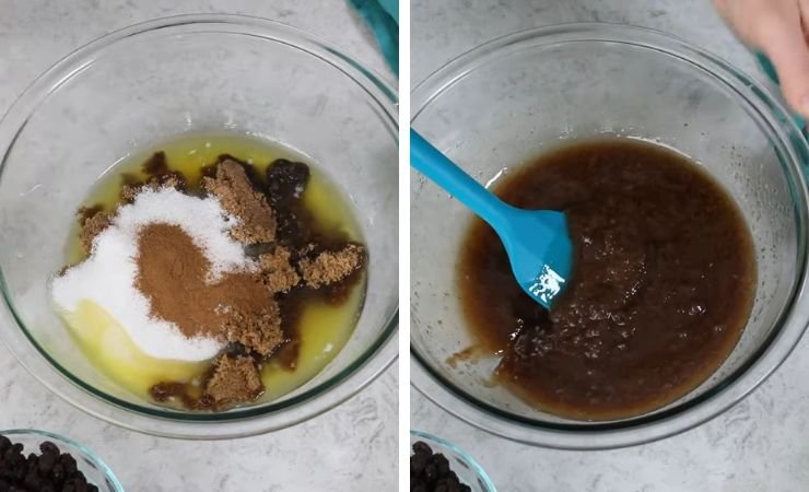 2. Mix the Sugars and Cinnamon: Pour the cooled butter into a large bowl. Add the dark brown sugar, granulated sugar, and cinnamon. Stir until smooth. The mix should look thick and even.