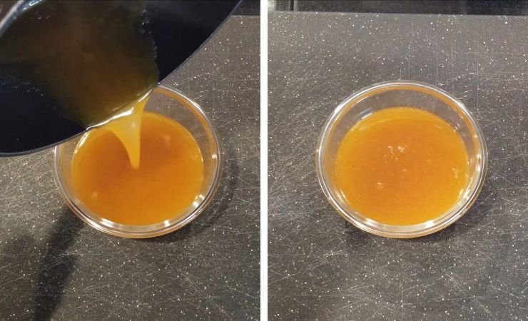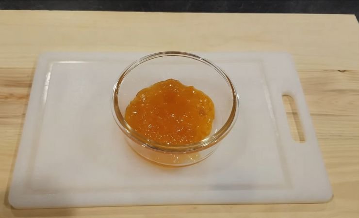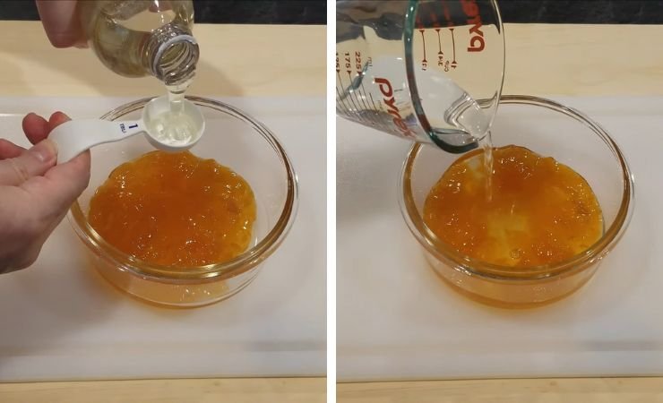 1. Measure the Preserves: Place one-fourth cup of apricot preserves and one-fourth cup of peach preserves into a mixing container. The preserves should sit at room temperature for easier blending.